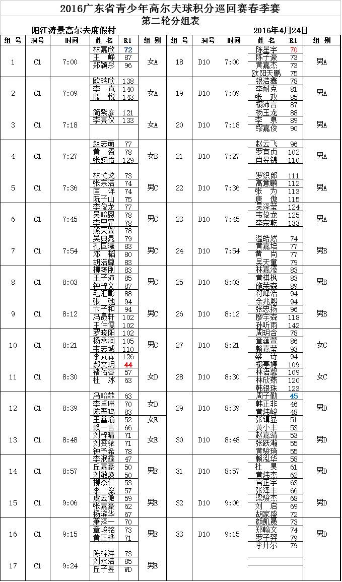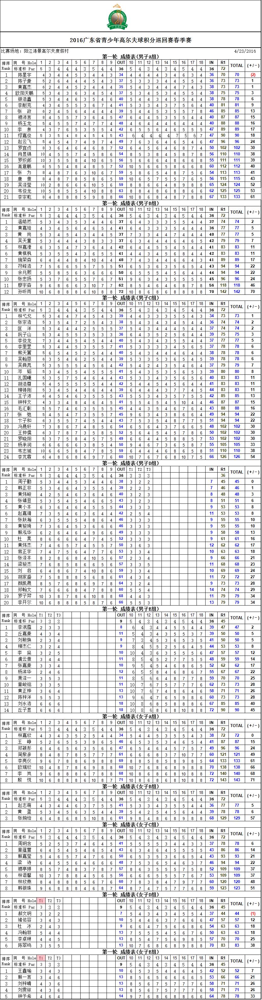 除了林嘉欣,周玥含也是刚改动作,不过后者更快地获得了想要的效果。周玥含认为改动作后对她攻果岭的一杆帮助明显,创造了很多鸟推的机会。阳江涛景C场5号洞素来有“魔鬼洞”的称呼,这同样给周玥含带来了困扰,首轮在这个洞打了+3让她考虑在次轮采取更保守策略,用小木杆获得稍稳定的开球。 首轮比赛在好天气下顺利结束,让众多选手期待次轮同样能得到老天的眷顾。首轮落后的选手将奋起直追,领先选手将面临更激烈的挑战。2016GDJGT首站冠亚季军即见分晓! 另外部分领先选手首轮个人挥杆照片: 男子B组温皓然 男子C组林弋戈 男子D组 周子勤 女子B组 赵志萌 女子D组 郝文玥 次轮分组表 备注:D/E组R1成绩为9洞个人比杆赛的总杆与切推挑战赛(3个定点标准杆为9)的杆数相加之和。 首轮成绩表 |