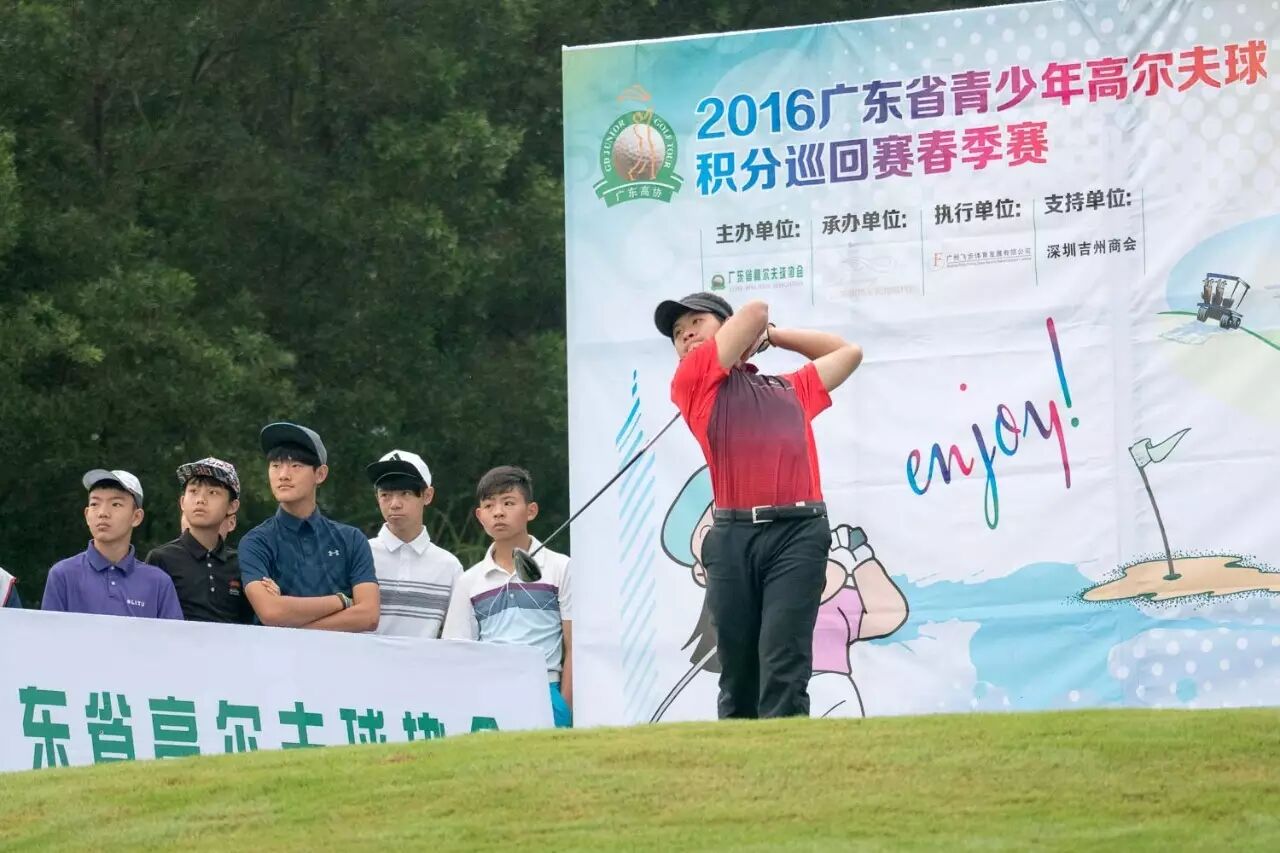 大好天气助春季赛首轮顺利进行 陈星宇-2杆 郝文玥-1杆获得组别领先GDJGT春季赛首轮于4月23日7:00在阳江涛景CD场打响。一开始出发员还冒着零星小雨站在发球台旁陪着首发选手等待开球时间的到来,前面几组选手都在小雨中挥出了自己的第一杆。不久天色转好,比赛随之进行得更加畅顺,最后各组别选手顺利完成了比赛,DE组别在完成了九个洞的比赛后回到练习果岭完成了计入总成绩的首轮三洞切推杆挑战赛。 陈星宇一号洞开球